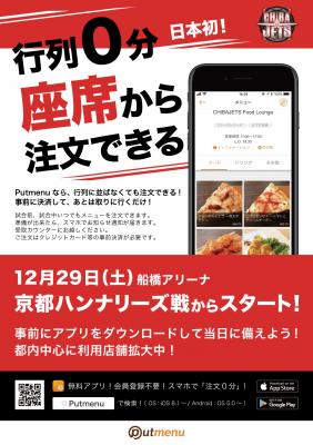 「Putmenu」は、スマートフォンに事前にアプリをダウンロードいただくことで商品の注文から決済までスマートフォン上で行えるアプリです。2018年12月29日より、男子プロバスケットボールチーム、千葉ジェッツふなばしのホームアリーナ「船橋アリーナ」「千葉ポートアリーナ」にPutmenuが導入されます。