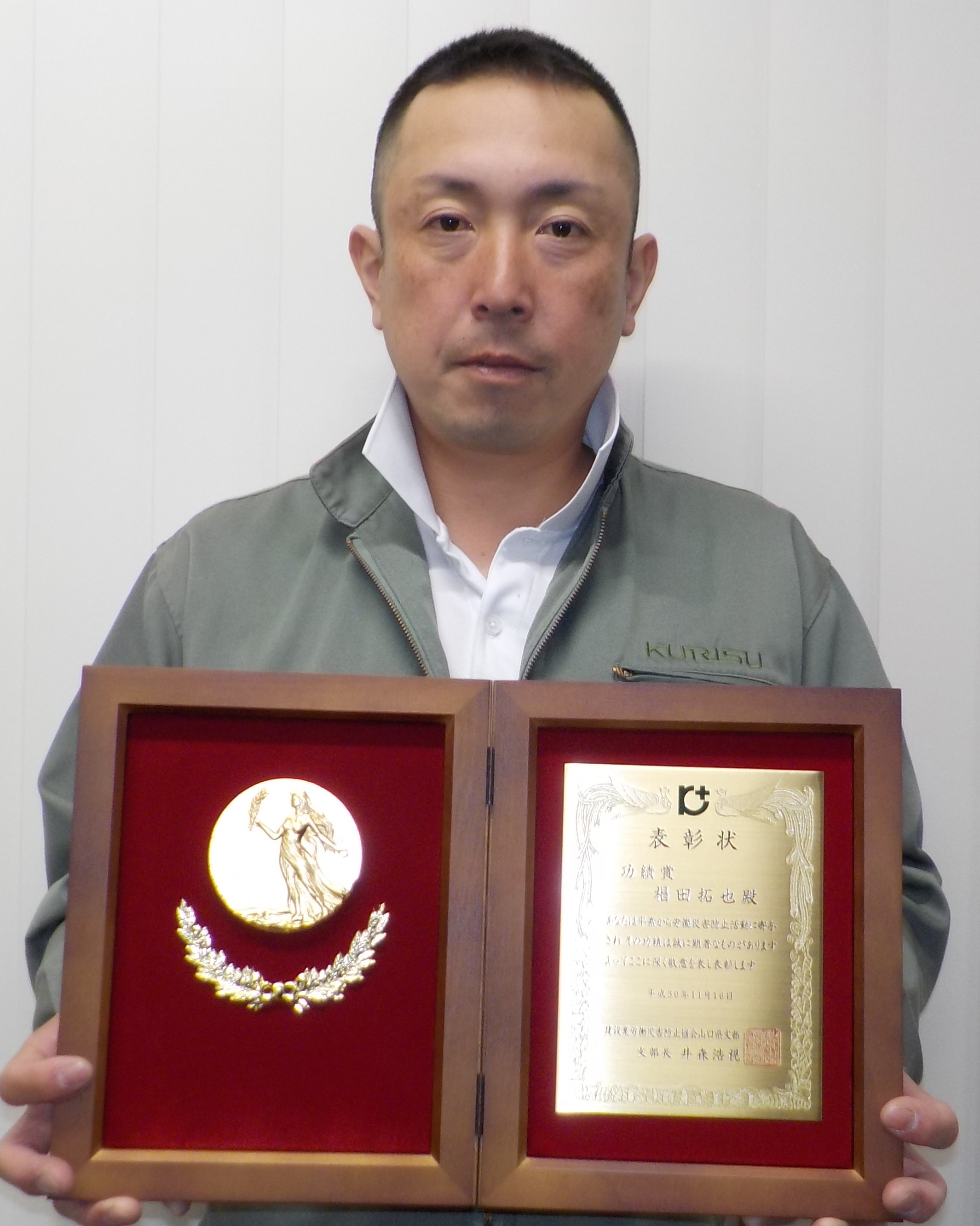 有限会社栗栖工業(本社:山口県宇部市、以下 当社)は、2018年(平成30年)11月16日に開催された【第54回山口県建設業労働災害防止大会】に於いて、当社社員の椙田拓也(すぎたたくや38歳)が優良な職長として建設業労働災害防止協会山口県支部長表彰「功績賞」を授与されました。