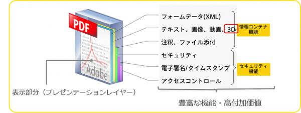 3D情報を含んだPDFファイルを ”3D PDF” と称しています。 3D PDFはマーケティング用の通称であり正式なフォーマット名称ではありません。”3D”もテキスト、画像などと同様に”PDF”に含まれる情報の一部です。 つまり、3D PDFは特別なファイルではなく無償のAdobe Acrobat Reader で閲覧、操作可能な PDF ファイルです。