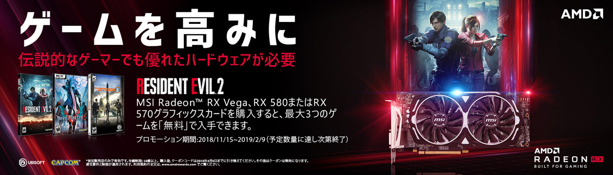 2018年11月16日 - Micro-Star International Co., Ltd. 台湾・新北市 - グラフィックスカード市場において、その性能の高さと品質で人気を誇るMicro-Star International(MSI)は、AMD Radeon RX Vega 64 / RX Vega 56 / RX 580 / RX 570を搭載したグラフィックスカードをご購入された方を対象に、2018年11月15日から2019月2月9日までの期間中、カプコンの人気アクションホラーアドベンチャーゲーム「バイオハザード:RE2」(Z指定バージョン)やアクションアドベンチャーゲーム「デビル メイ クライ 5」、Ubisoft EntertainmentのオープンワールドアクションRPGゲーム「Tom Clancy’s The Division 2」といった最新ゲームタイトルのアクティベーションコードが最大3つもらえる「AMD - ゲームを高みに!」キャンペーンを実施いたします。