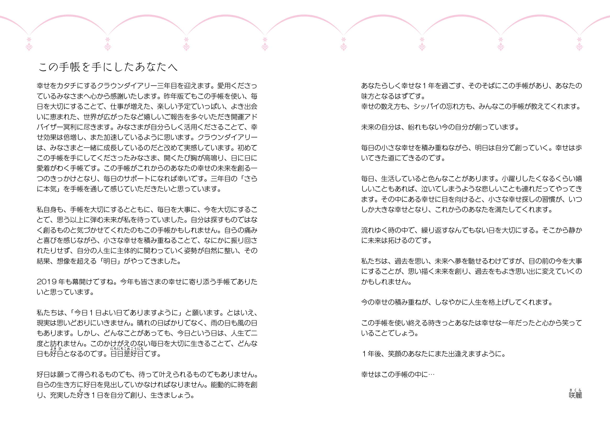 2色展開のベビーピンク、エメラルドブルーに2019年のラッキーカラー「スノーホワイト」を取り入れてかわいいツートーンカバーに。運勢、風水コラムも満載。使うだけで幸せになること間違いなしです!