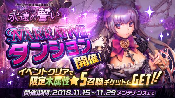 また、イベントをクリアすると限定木属性★5召喚チケットやバートリーを描いた★5ソウルカルタ「アンダーザローズ」など豪華報酬を手に入れることができるNARRATIVEダンジョン『永遠の誓い』も開始となりましたことを合わせてお知らせいたします。ぜひ、ご注目ください。