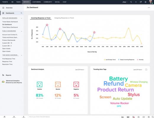 ● Zoho Desk、CRM、SalesIQ、「Zia」の機能により、企業は顧客が抱える問題に対して適切なタイミングで適切な解決策を提供できます。同時に、営業やサポート担当者の生産性向上と情報提供にも役立ちます。
