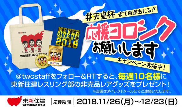 Twitterの当アカウント(@twcstaff)をフォローし、キャンペーンツイートをリツイートすると、東新住建レスリング部の選手3名(伊藤彩香選手・登坂絵莉選手・土性沙羅選手)のイラストが入ったトートバッグや限定Tシャツなどの非売品グッズ4点セットを、毎週10名様にプレゼントいたします。応募期間は第1弾が11月26日(月)~12月2日(日)23:59まで。その後、毎週月曜日から日曜日まで、天皇杯最終日の12月23日(日)23:59が締切りとなる第4弾までご応募いただけます。