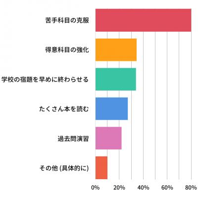 冬休みに学習面でお子さんに達成してほしいことはなにかについては、約80%の方が「苦手科目の克服」と回答されました。ついで「得意科目の強化」と「学校の宿題を早めに終わらせる」が30%強、「たくさん本を読む」が30%弱、「過去問演習」が約20%となりました。
