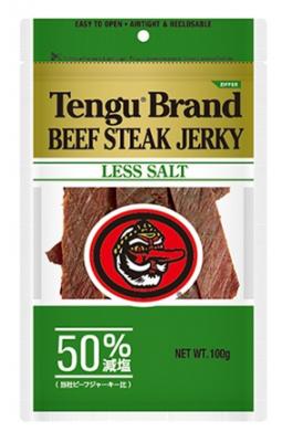 本年10月には、通常の『テング ビーフステーキジャーキー レギュラー』と比べて塩分を50%カットし、かつテングブランド本来の旨味はそのままに仕上げた『テング ビーフステーキジャーキー 50%減塩』も発売しました。食塩と無機塩の独自の配合に加え、減塩しょうゆを用いることで、『テング ビーフステーキジャーキー』の美味しさそのままに、50%の減塩を可能にしています。