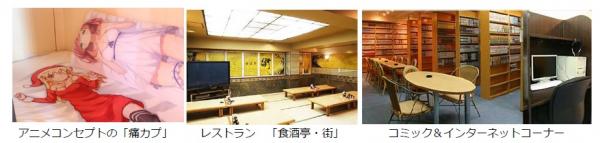 当館はお風呂以外にもカプセルホテルとして、様々なコンセプトを持ったカプセルルームがあります。抱き枕やシーツなどアニメのキャラクターを全面に打ち出した「痛カプ」、忍者・武将・花魁等をテーマにしたカプセルフロア「クールジャパンフロア」は外国人の宿泊客に大人気です。