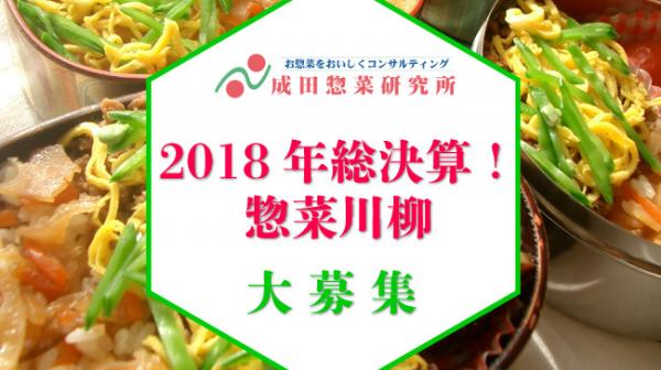 お惣菜コンサルタント「成田惣菜研究所」(有限会社ナリタヤ 代表取締役:成田廣文)が運営する「成田惣菜研究所」< https://narita-souzai.co.jp/ >は、 2018年11月20日(火)より、「2018年総決算!惣菜川柳」(以下「惣菜川柳」)の作品募集を、 特設ページ(PC・スマートフォン)にて開始いたしますのでお知らせいたします。
