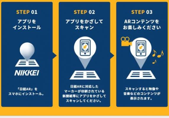 使い方はとても簡単。「日経AR」アプリをスマホにインストールし、新聞紙面等に印刷された指定の「マーカー」を読み取るだけ。