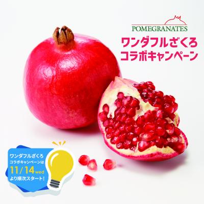 日本国内では、「ワンダフルざくろ コラボキャンペーン」参加店舗以外にも、一部店舗を除く全国のAEON(イオン)で生食用カリフォルニア産ざくろが販売されるほか(11月~12月を予定)、全国でフルーツバーを展開する株式会社青木商店( http://k-karin.jp )が、カリフォルニア産ざくろ100%ジュース「生搾りザクロ」(11月26日から、価格:Sサイズ570円 Mサイズ870円)を提供いたします。強い甘さとほのかな酸味が特徴のカリフォルニア産ざくろを是非、お楽しみください。