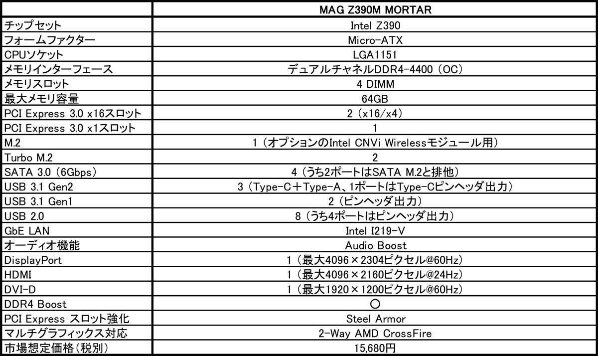 2018年11月22日 - Micro-Star International Co., Ltd. 台湾・新北市 - マザーボードの設計で世界をリードするMicro-Star International(MSI)は、第9世代Intel Coreプロセッサに対応するIntel Z390チップセット搭載GAMINGマザーボードに、Micro-ATXフォームファクターを採用したエントリーモデル「MAG Z390M MORTAR」を追加し、11月23日に発売いたします。市場想定価格(税別)は、15,680円です。