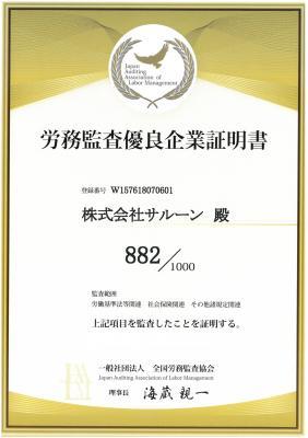株式会社サルーンは飲食業界では初めて、「労務監査優良企業」に認定されました。(協会調べ)