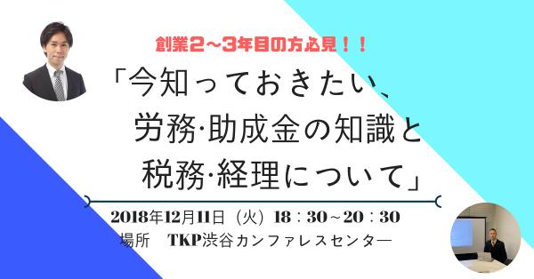 12月11日(火)創業2~3年目の方を対象に「今知っておきたい、労務・助成金の知識と税務・経理について」のセミナーを税理士法人グランサーズ(東京都品川区東五反田)と社会保険労務士法人MRパートナーズ(東京都武蔵野市吉祥寺)が共催で開催いたします。弊社の代表社員の筧智家至(かけひちかし)とMRパートナーズ代表社員の猶木貴彦(なおきたかひこ)が講師を務めます。