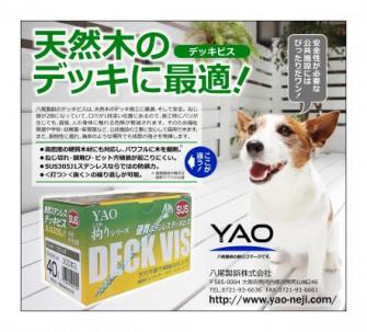 八尾製鋲株式会社(大阪府河南町、社長・河野伸幸)では、天然木ウッドデッキの工事用ビス「デッキビス」の箱型パッケージをリニューアルいたしました。同品は、天然木を使った本格派のウッドデッキ工事を需要ターゲットとした製品です。天然木のウッドデッキは、木の風合いが伝わる癒し感が人気を博し、近年、建築件数が右肩上がりに伸びています。弊社の「デッキビス」は、このようなニーズの増加をキャッチするとともに、当該のジャンルでもっともクオリティの高い、いわば決定版となることを意識して開発されました。まず、独自技術のねじ形状によりパワフルな掘削性能を実現。硬質木材にも対応し、下穴を開ける工程を省力できます(座彫り下穴が必要となる場合もあります=超硬質木材)。また、優れた耐食性を持つSUS305J1ステンレスを採用。海岸沿いなどのサビが起こりやすい環境でも非常に高い防錆力を発揮します。さらには、ねじ頭が面落ちになっていて、四角穴が1段深い位置にあるので、施工時にバリが生じても、直接、人の身体に触れる危険が軽減されます。そのため福祉関連や学校・幼稚園・保育園など、公共施設のウッドデッキに安心して使えます。これらの特長をグリーンとイエローの2色で彩ったオリジナル新パッケージで包み込み、高付加価値なプロ向け商材のステージで、指名買いされる確固としたポジションの構築に取り組みます。新しいパッケージは、10月31日よりホームセンターなどで流通。販売取り扱いの商社・小売店などの詳細につきましては、八尾製鋲営業部に直接お問い合わせください。