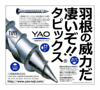 八尾製鋲株式会社(大阪府河南町、社長・河野伸幸)では、CIシステム導入に引き続き、主力製品「タピックス」の専用ロゴマークを設け、同品のパッケージや販促物、広告に表示し、CIとともにビジュアル面を強化したプロモーションを展開することとなりました。「タピックス」は、木材用ビスとしては、もっともポピュラーで、需要の主流であるコーススレッドタイプに属する製品ですが、独自技術によるねじ形状で木割れリスクを抑える性能により、競合品とは一線を画するブランド力を確立しております。専用ロゴマークのデザインにあたっては、このような「タピックス」の強みに立脚し、究極のコーススレッドを意味する英語のステートメントを挿入しました。これは、ねじ業界や建築業界で平凡ともいえるコーススレッドのジャンルにおいて、あくまでも非凡な存在でありたいと望む意欲の表明であり、メーカーとしての誇りを示す言葉に他なりません。ものづくりに取り込む者のプライドをロゴマークにこめて、ユーザーに1本でも多くの「タピックス」をご使用いただけるよう、活発なメッセージ発信を推し進めて行く考えです。なお、ロゴマーク入りパッケージのデビュー(第一弾)は、シリーズ品「エクスタップ」のリニューアル出荷となる12月15日以降の予定です。販売取り扱いの商社・小売店などの詳細につきましては、八尾製鋲営業部に直接お問い合わせください。