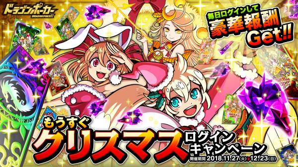 株式会社アソビズム(本社:東京都千代田区、代表取締役:大手智之)は、App Store・Google Playにて好評配信中のリアルタイム合体カードバトル『ドラゴンポーカー』で、2018年11月27日(火)より 「もうすぐクリスマスログインキャンペーン」を開催いたします。5日ログインごとに「女神スキルフェアリー」や「女王サンタフェアリー」など豪華アイテムをプレゼント!ログイン25日目には「SSレアガチャチケット」が必ずもらえます。『ドラゴンポーカー』に毎日ログインして、豪華報酬を受け取りましょう!