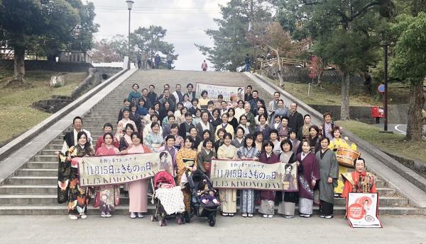 今年の参加者は約100人、歩くルートはスタートのJR奈良駅東口広場から奈良三条通り商店街を進み、猿沢池までと、毎年恒例になっています。毎年参加を楽しみにしている人はもちろん、新しく今年から参加する人も増え「着物を楽しむ人を増やしたい」という思いが実現しています。