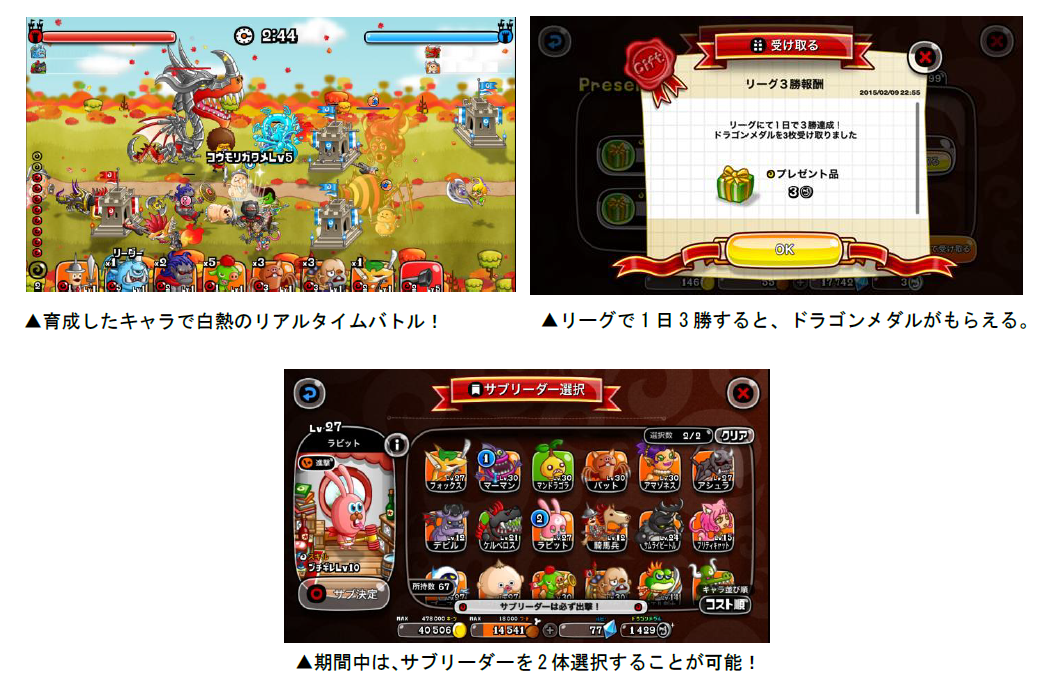 全国のユーザーたちを相手にリアルタイムで戦い、ランキングを競い合う「リーグ」が開催!ひとりで挑戦できるのはもちろん、友達と一緒にタッグ・トリオ戦にも挑むことができます。また、期間中、サブリーダーを2体まで設定できる「サブリーダー増加バトル」を同時開催いたします。サブリーダーを有効活用して、バトルに勝利しましょう!