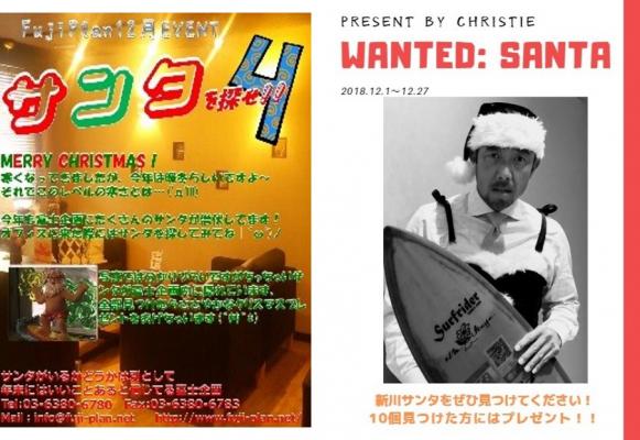 不動産投資事業をおこなう富士企画株式会社(本社:東京都新宿区、代表取締役社長:新川義忠)と株式会社クリスティ(本社:埼玉県さいたま市、代表取締役社長:新川義忠)は、顧客や取引先関係者、その家族も参加して、クリスマスイベント『サンタを探せ!』を各オフィスで2018年12月1日~27日に開催します。富士企画では4回目、クリスティでは初めての取り組みです。