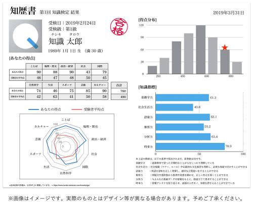 本検定の受検者には、「知歴書(ちれきしょ)」を贈呈します。合否判定だけではなく、どれだけバランス良く知識を保有しているのかが一目瞭然となります。バランスとは、検定の出題10ジャンルの知識のバランスのことです。偏った知識ではなく、全てのジャンルの知識を網羅してはじめて、合格となるのです。「知歴書」でジャンルごとの知識の偏りが明らかになることで、今後のあなたの“知識対策”の手助けにもなります。