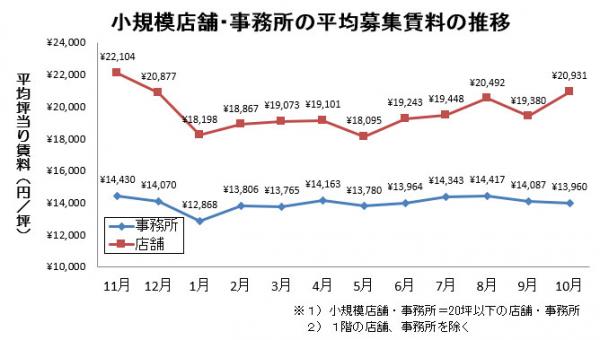 池袋の小規模事務所(20坪以下)の10月度平均募集賃料は、前月から0.9%下降しました。