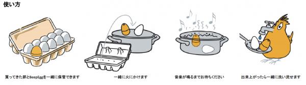 ポイントは、BeepEggを卵と同じ温度で保管すること。冷蔵庫で卵を保管している場合は、BeepEggを卵と一緒に冷蔵庫で保管してください。そして使うときは、卵と一緒にお湯の中に投入していただくだけ。3つのメロディがお好みの固さの出来上がりを知らせてくれます。