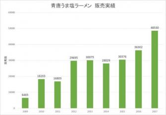 青唐うま塩ラーメンは、2009年より、一部店舗で販売を開始し、坂内として初めて「辛いラーメン」に挑戦をしました。味の特徴から、「辛さの苦手な方は注文しない」商品ではあり、これまで販売した限定商品ほどの販売数には及びませんでした。販売から10年、現在では、青唐うま塩ラーメンの販売の時期にしか来店されないお客様もいらっしゃるほどとなり、リピーターの多い冬の人気商品となっています。