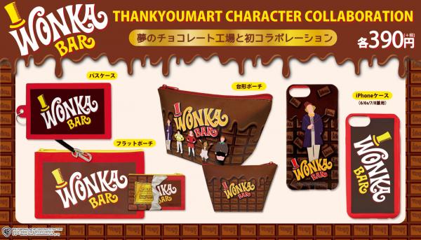 今回発表するのは、iPhoneケース2種・パスケース・台形ポーチ・フラットポーチ。2018年生産終了が発表された「ウォンカチョコレート」、工場長ウィリー・ウォンカや工場に招待された子どもたちなど!ファンタジーの世界観が楽しめる、サンキューマートならではのコラボ商品をお届け致します♪