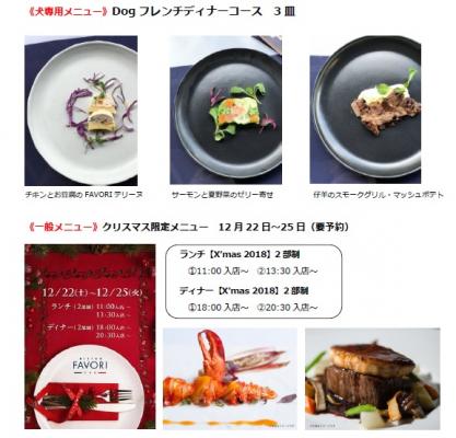 株式会社シティコミュニケーションズ(本社:横浜市 代表:三田大明)が運営するフレンチレストラン「BISTRO FAVORI(ビストロ ファヴォリ) 代官山」では、愛犬と一緒にディナーが楽しめる犬専用の食事「Dog フレンチディナーコース」(飼い主の方がお食事をされた場合の無料サービス)が好評です。普段はディナーの時間帯でのサービスですが、クリスマス営業(12月22日~25日)に限りランチの時間帯でも《メインディッシュ》「オーストラリア産仔羊のスモークグリル・マッシュポテト」を無料でプレゼントいたします。