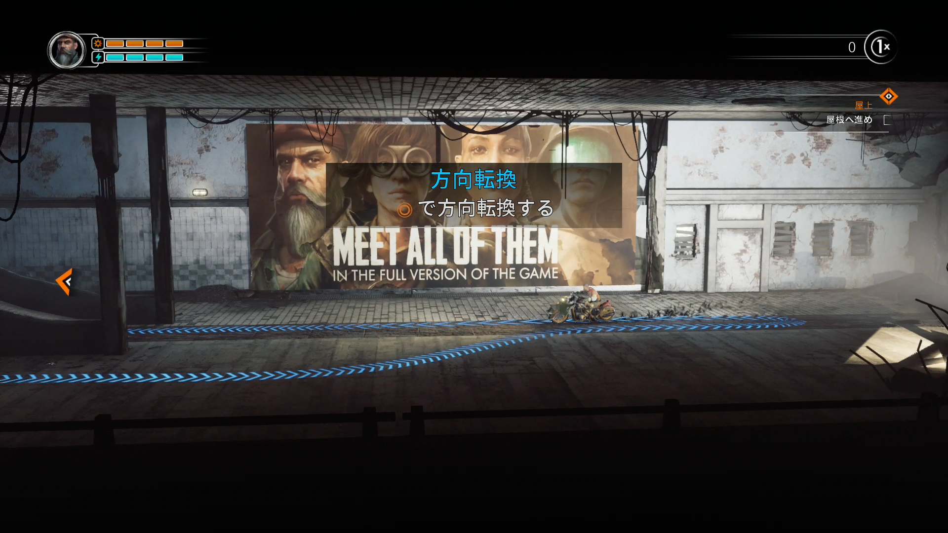 画面の案内に従って、ベーシックなゲームプレイを体験することができます。レーンの変更やUターン、ホイールソー、ジャンプやダッシュ、垂直走行の仕方から発電機の操作方法に至るまで、ゲームを遂行するにあたって必要となる基本操作を画面表示に従って習得することが可能です。