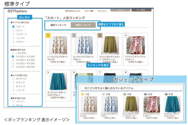 BSTは、サイト内検索を中心に多くのサイトで成果を上げてきたサイト内ナビゲーション改善のノウハウをもとに、ランキングコンテンツを商品情報とユーザニーズのマッチング強化に手軽に活用いただける「ポップランキング」を開発・提供しました。