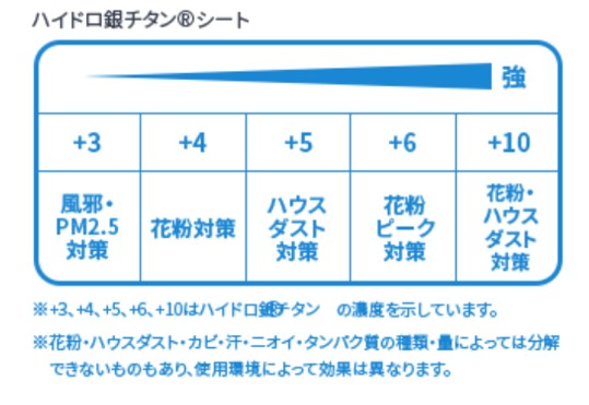 ハイドロ銀チタン(R)は、タンパク質を分解する触媒物質で、花粉・ハウスダスト・カビ等のタンパク質や、汗・ニオイ・不衛生タンパク質を分解して水に変える効果があります。分解作用は水分子レベルでの変化なので、マスクが