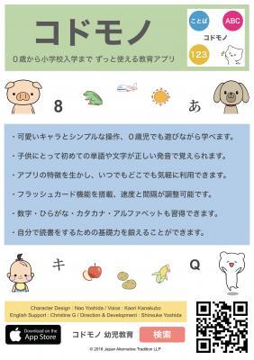 有限責任事業組合ジャパン・オルタナティブ・トラディッション(東京都文京区)は、2018年12月10日にiOSアプリ「コドモノ - 幼児教育」を無料リリースいたしました。