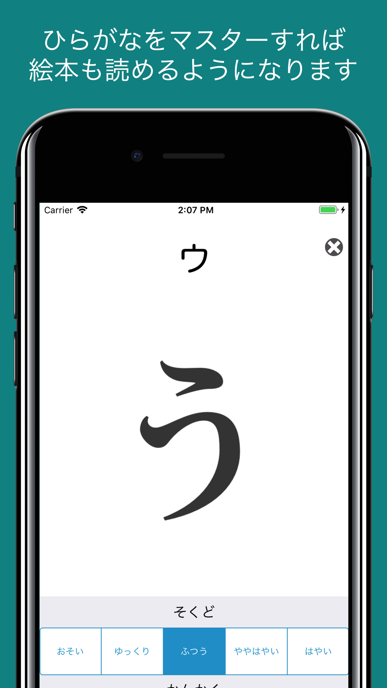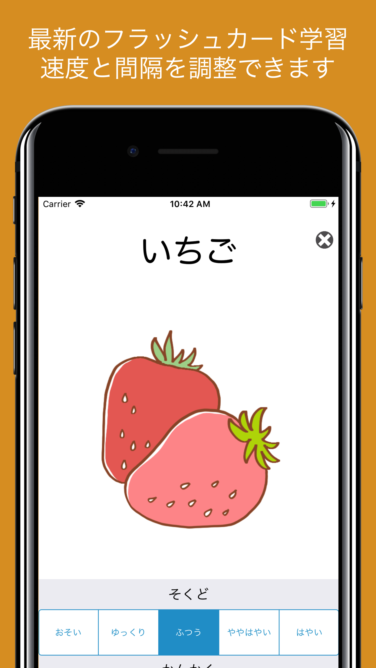 音声とともに画面上に画像が表示されます。音声が終わると画像が切り替わり、次の音声が表示されます。また画面下部のボタンをタップすると音声速度と間隔を調整することが可能です。年齢に応じて使い分けてください。近年フラッシュカードを利用した英語教育や漢字教育が流行っています。次々と画面が切り替わるので、お子さんは飽きることなくアプリに集中できるはずです。