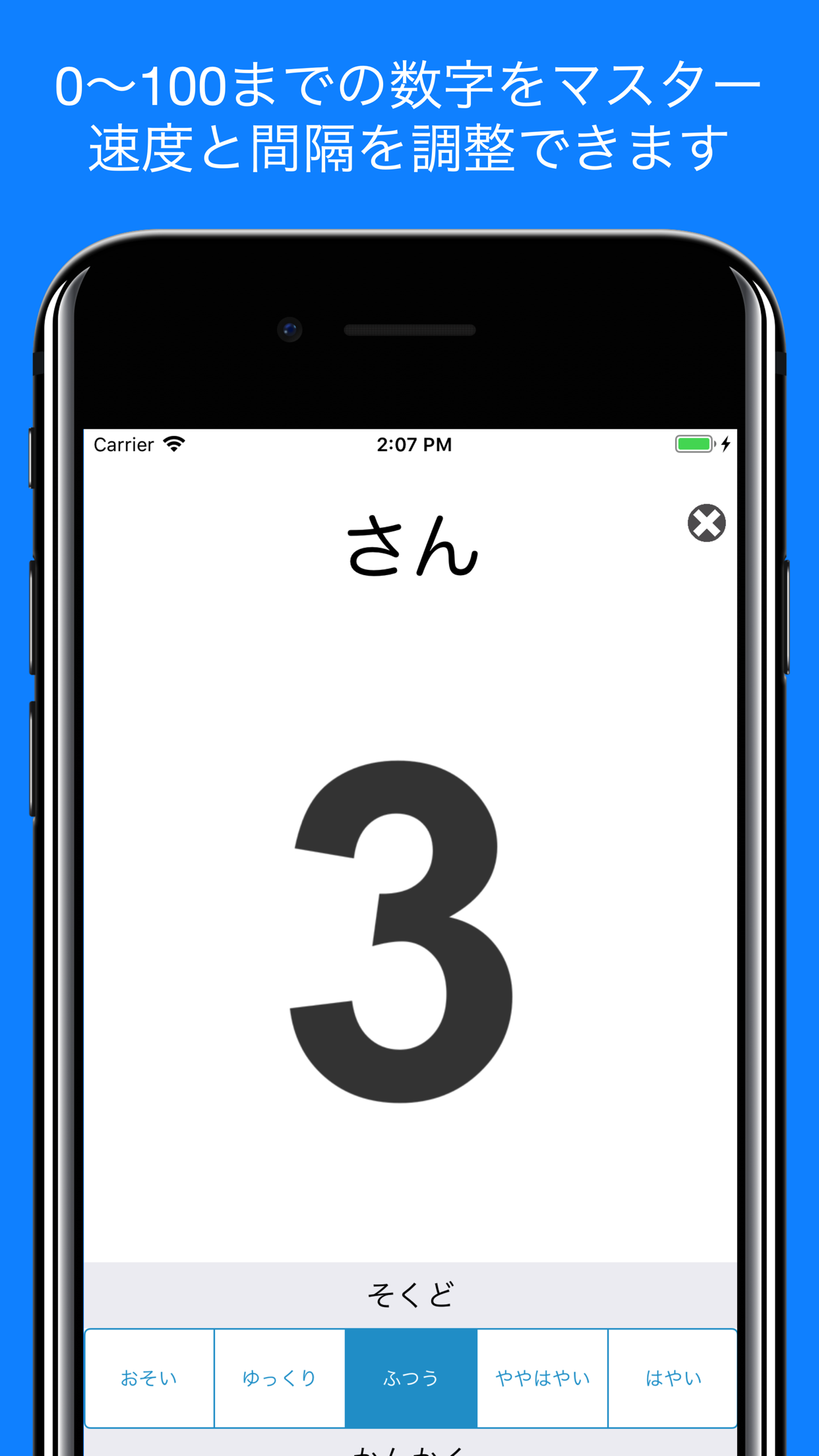 音声とともに画面上に数字が表示されます。数字の概念を覚えるために利用することもできますし、音声をオフにすることでフラッシュカードの要領で学習することもできます。年齢に応じて使い分けてください。年齢や電話番号の表現で混乱を起こさないよう、4は「よん」、7は「なな」の読み方で統一しています。