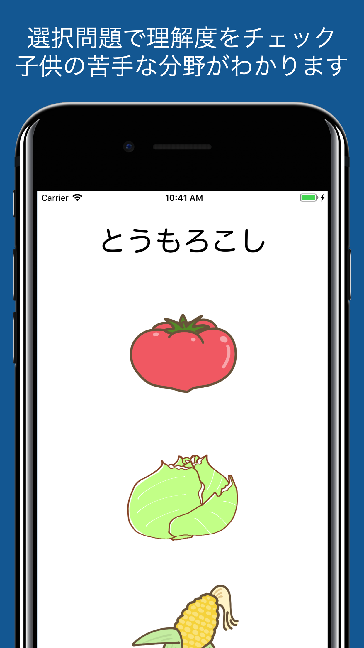 画面をタップすると野菜や果物などカテゴリーごとに分類された画像が「なにかなぁ?」という音声とともに表示されます。しばらくすると矢印ボタンが表示されるので、ボタンをタップすると、答えとなる音声と文字が表示されます。お子さんの年齢が3~4歳になると、自ら答えとなる単語を口にするはずです。まだ小さいうちは音声をオフにして、ご家族が「これはなにかなぁ?」と聞いてあげるのも良いかもしれません。