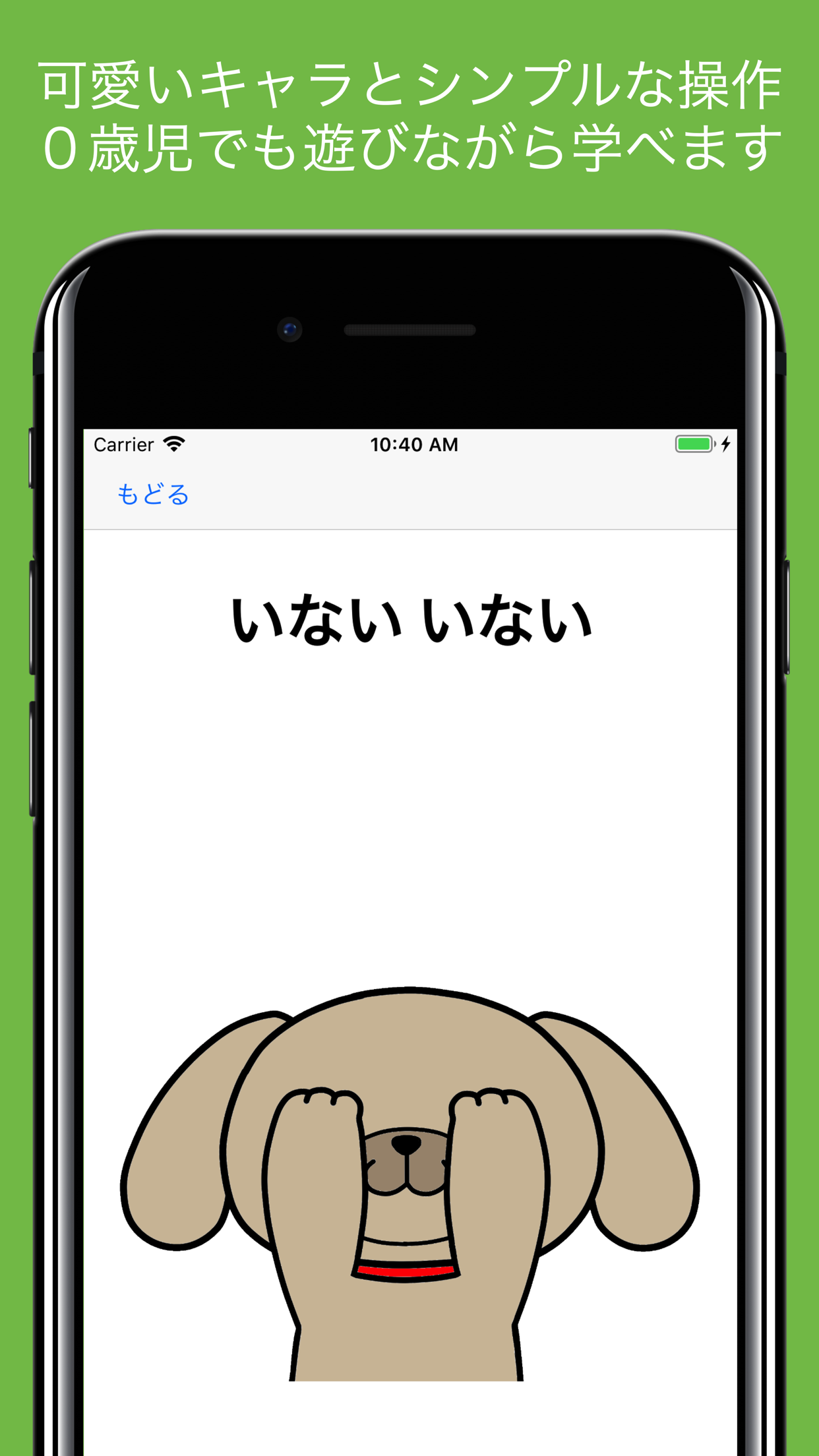 画面をタップすると音声とともにキャラクターが表示されます。いわゆる「いない いない ばぁ」をするだけの単純な機能ですが、0歳児のお子さんは興味を持つはずです。音声をオフにして、ご家族が「いない いない ばぁ」と口に出してあげるのもいいかもしれません。ここでは簡単な家族や動物の概念を覚えることもできます。