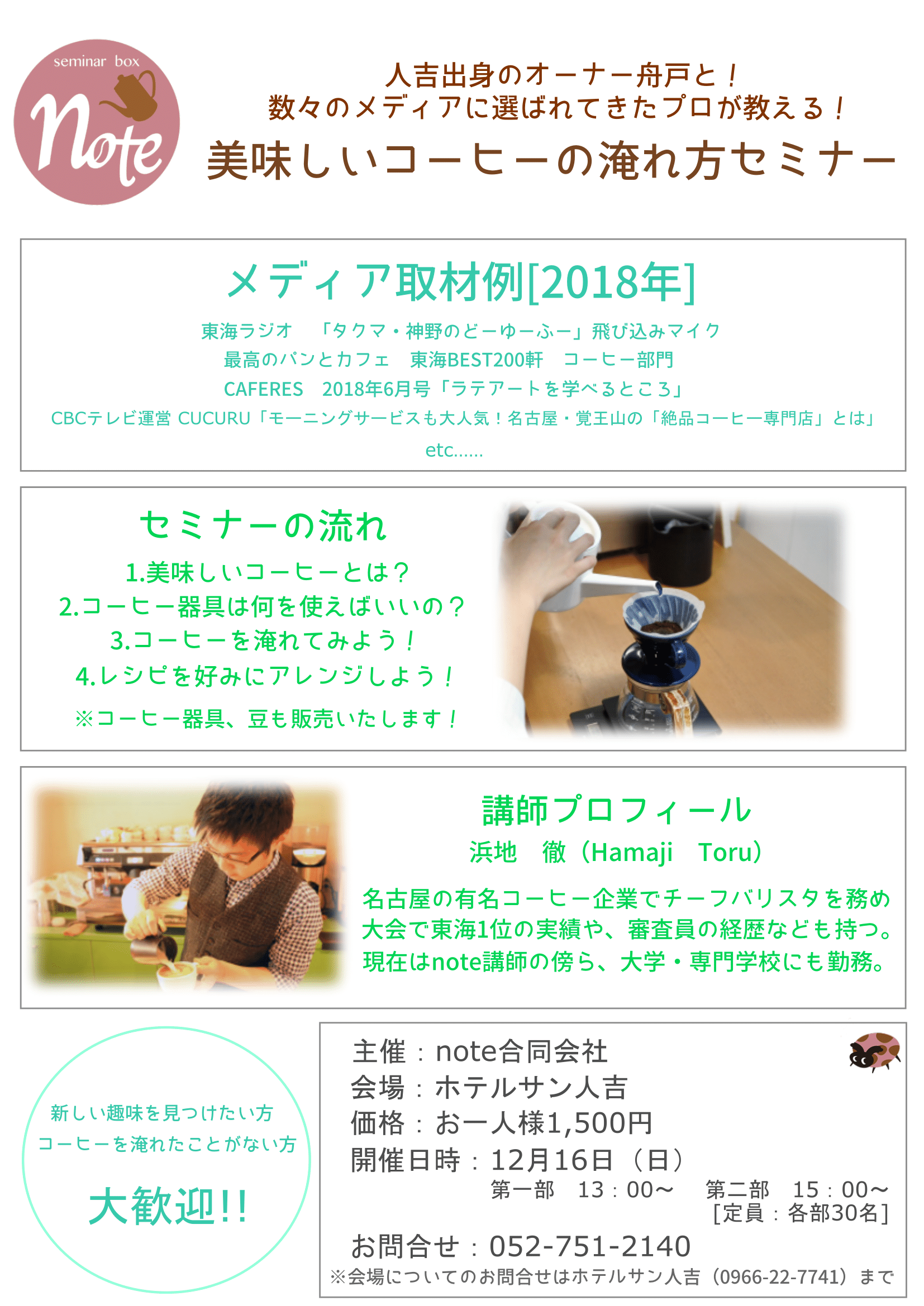 大学や専門学校とも講師契約を結ぶコーヒー専門のセミナールーム『seminar box note』(運営:note合同会社 所在地:名古屋市千種区)が、2018年12月16日(日)に熊本県人吉市でコーヒーセミナーを開催いたします。