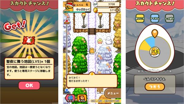 イベント期間中にパリピなぐでたまを落ち着かせると発生する場合がある「スカウトルーレット」の青ゾーン抽選獲得で、地図アイテム「聖夜に舞う地図(Lv5)」が入手できます。