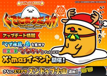株式会社グッドラックスリー(本社:福岡県福岡市、代表取締役社長:井上和久、以下「グッドラックスリー」)とギャザリングホールディングス株式会社(本社:東京都千代田区、代表取締役CEO 戸田和宏、以下「ギャザリング」)は、株式会社サンリオ(本社:東京都品川区、代表取締役社長:辻信太郎、以下「サンリオ」)よりライセンス許諾を受け、人気キャラクター「ぐでたま」が登場するゲームアプリ『ぐでたまクエスト』(以下、本作)をにおいて、本日2018年12月13日(木)より期間限定のX’masイベントを開催した他、新たに新エリアである「ズンドゥブ火山」を追加したことをお知らせいたします。