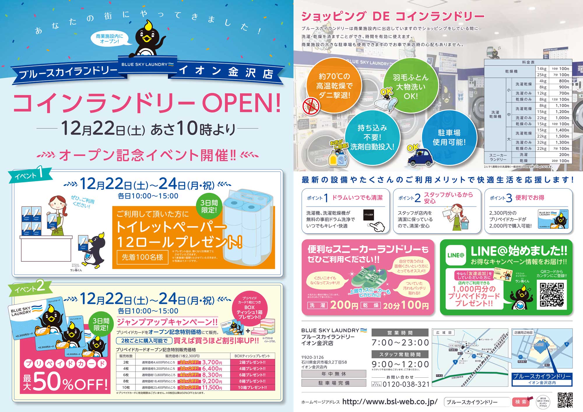 この度2018年12月22日(土)より石川県金沢市イオン金沢店内にブルースカイランドリーイオン金沢店を出店致します。