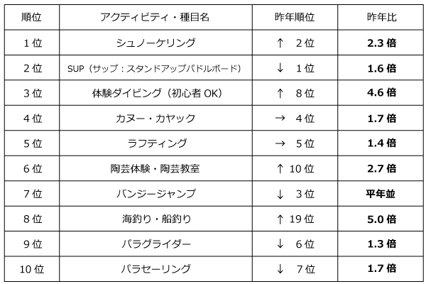 以下アクティビティジャパン)は、2018年の予約データ(2018年1月1日~2018年11月30日までの予約)を元に、2018年の『アクティビティ年間人気ランキング』を発表いたします。