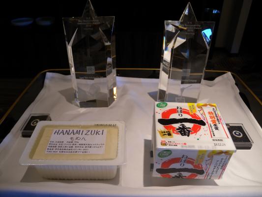 今年度の第2回納豆部門では原田製油(有)(大分県大分市)の「ねばり一番」が、第1回木綿豆腐部門では伊丹食品(株)(北海道札幌市)の「HANAMIZUKI もめん」がそれぞれ受賞し、USSECより今回改めて記念トロフィーを両社へ授与しました。
