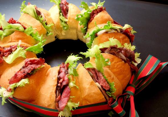 サンドイッチパーラー楽楽で人気のローストビーフサンドを、クリスマスを祝うリース型に仕立てました。国産小麦を使用した小麦の香り豊かなふんわりちぎりパンに、ローストビーフがはみ出るほどサンドしたボリューム満点のサンドイッチです。シェアしやすく、4~6名様程度でお召し上がりいただけるサイズでパーティにおすすめです。