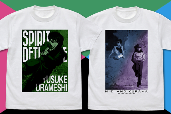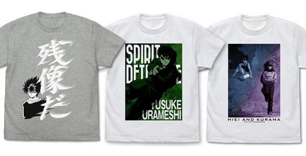 主人公の霊界探偵 浦飯幽助が“霊丸(れいがん)”を放とうとする姿を捉えたデザイン、飛影自らが名の通りの早業をみせた際のセリフ“残像だ”を大胆にデザイン。そして、飛影と蔵馬がクールに佇む姿をデザインした、それぞれのTシャツが登場!