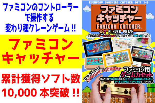 株式会社東洋(本社:埼玉県北本市/代表取締役 中村秀夫) が経営する、1店舗当たりのクレーンゲーム設置台数がギネス世界記録に認定されている 「世界一のゲームセンター エブリデイ行田店(埼玉県行田市)」において、2017年6月15日に【ファミコンの日(7月15日)】に先駆けて登場させた、ファミコンのコントローラーで操作する面白クレーンゲーム『ファミコンキャッチャー』が2018年12月19日、稼働開始から約1年半で、ファミコンソフト(※中古)が景品の2P側で、獲得された累計ファミコンソフト数が、1万本を突破致しました。