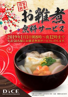食事提供を行っている店舗のみ、1月1日朝8時~夜12時まで先着50名様にお雑煮の無料サービスをいたします。