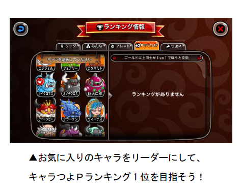 12月21日(金)メンテナンス後より、「キャラつよP」機能をプレオープンします。「キャラつよP」は、そのプレイヤーが「どれだけ強いか?」を「リーダーで使ったキャラごと」に記録するポイントです。ゴールド以上のクラスに所属している同士がひとりでリーグでバトルを行うとバトルを行うとその結果に応じてポイントが増減します。自分のお気に入りキャラを使って、ランキング1位を目指しましょう!