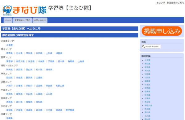 「学習塾【まなび隊】」は、幼児・小学生・中学生・高校生のお子さまとその保護者を対象にした学習塾のご紹介サイトです。簡単に教室の紹介ページが作成でき、掲載内容の更新も容易に行えます。基本的な情報の掲載は無料です。