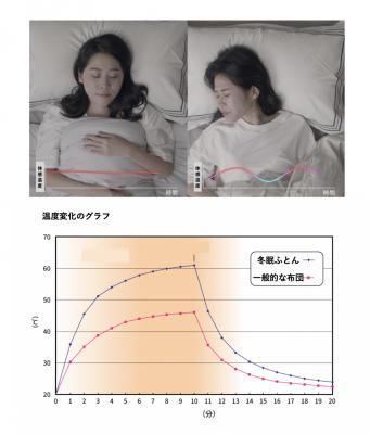 また、グラフェンの熱伝導率の高さは「布団に入ってもヒヤヒヤして眠れない・・・」という問題も解決します。冬眠ふとんは綿や羽毛の布団に比べて、短時間で高い温度に達します。